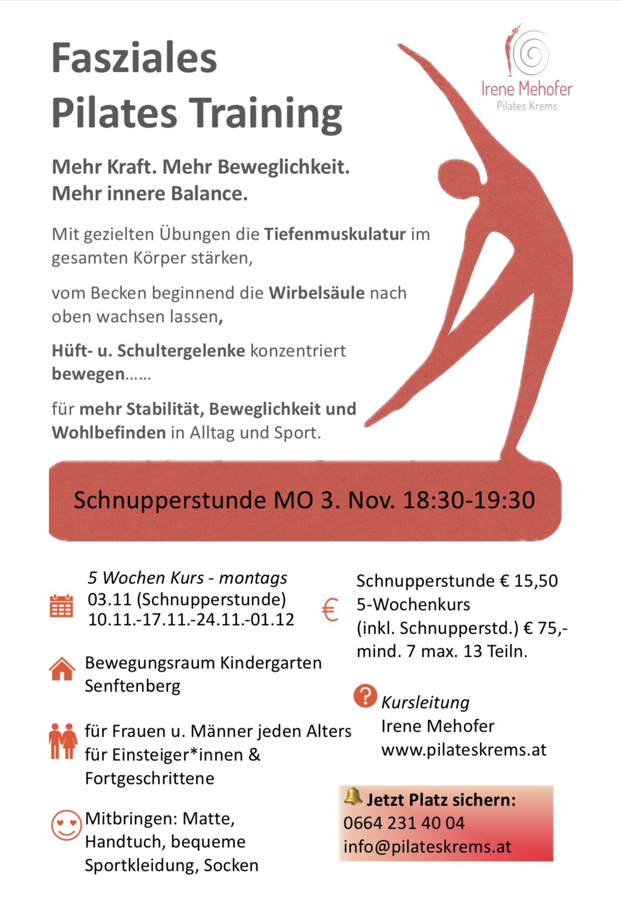 Anmeldung über Anmeldung (Buchungssystem) oder Email: info@pilateskrems.at